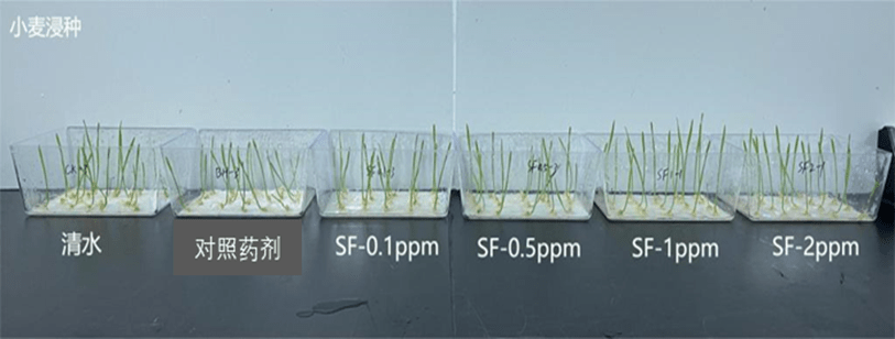 (2)針對(duì)小麥作物:浸種處理后發(fā)現(xiàn),試驗(yàn)范圍內(nèi)的花粉多糖對(duì)小麥株高、根長(zhǎng)、株重、根重均具有促進(jìn)作用,其中在2 ppm處理下,相比陽(yáng)性對(duì)照處理,花粉多糖處理后小麥株高、根長(zhǎng)、株重及根重分別增長(zhǎng)12%、24%、45%、43%。