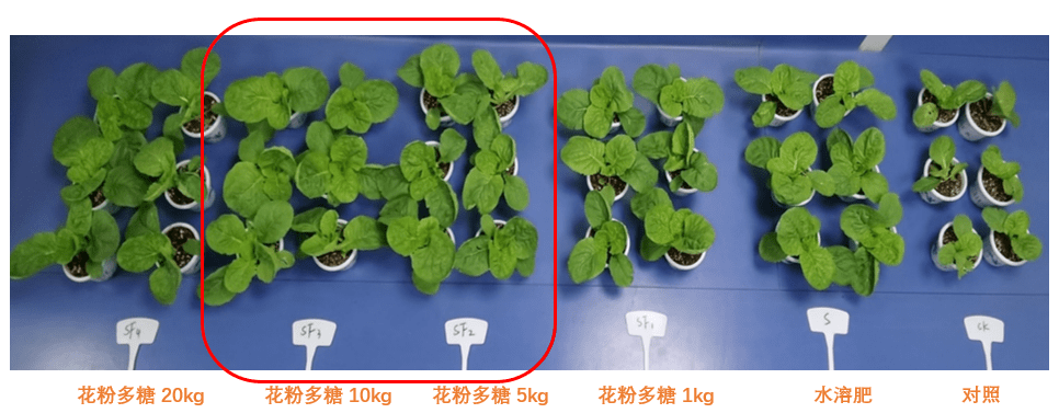 (1)花粉多糖復(fù)配水溶肥提效增產(chǎn)。在水溶肥中添加5-10kg/t花粉多糖,可促進(jìn)小白菜光合作用,顯著提高葉綠素含量10.97%,促進(jìn)小白菜葉片生長(zhǎng),地上部生物量增加34.0%-41.78%;同時(shí),水溶肥復(fù)配花粉多糖,能提高小白菜的營(yíng)養(yǎng)品質(zhì),促進(jìn)葉片Vc含量及可溶性糖含量積累。